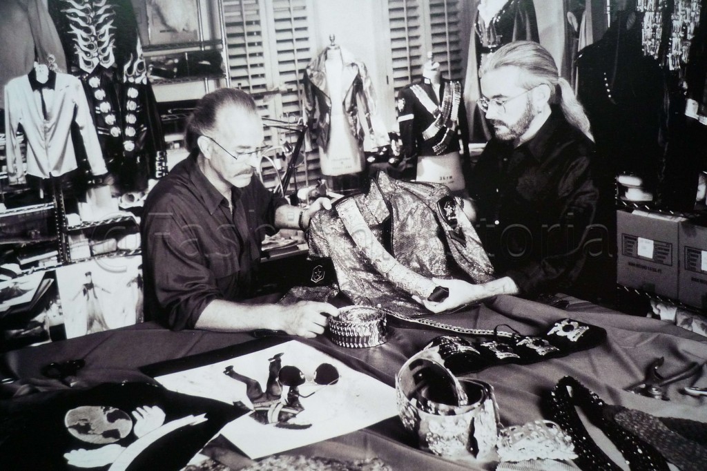 Michael Bush and Dennis Tompkins were in charge of the fit, function, application, and maintenance of Jackson’s wardrobe for twenty-five years. Though Bush suggests “magic” is involved in every step of the process, his tales of the unending hours devoted to researching ideas, presenting Jackson with outrageously intricate handmade prototypes or finished products, and then maintaining them during tours repudiates the presence of mystical forces. Bush and Tompkins labored to anticipate Jackson’s taste—they repeatedly dipped into his favorite themes of Peter Pan and Tinkerbell and his obsession with British royalty, essentially reworking the same seven patterns with different decorative “icing” to keep the looks fresh.
