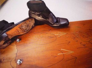 "These worn-out size 9 1/2 'dance shoes' from the Bad Tour have a piece of elastic on either side of the top part, which enabled the shoe to stay on when Michael danced and kicked." (pg. 54)